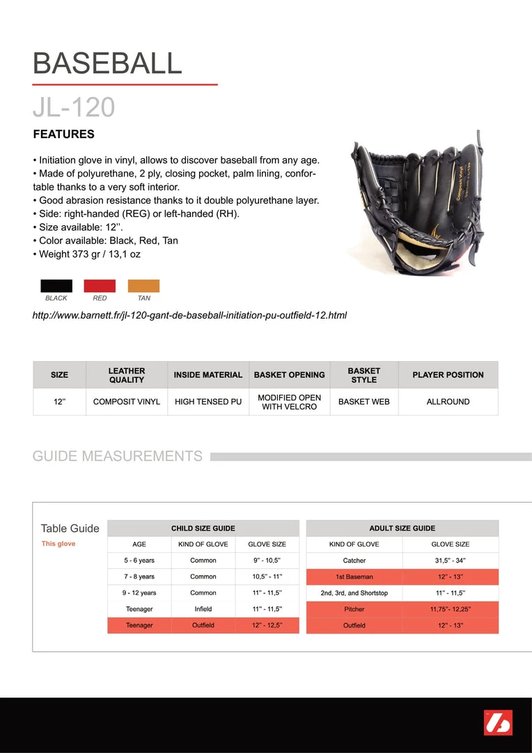 Initiation vinyl glove, enables to discover baseball at any age. Polyurethane, 2 foldings, closed pocket, palm reinforcement. Very comfortable with soft inside and resistant to abrasion thanks to its double polyurethane layer.