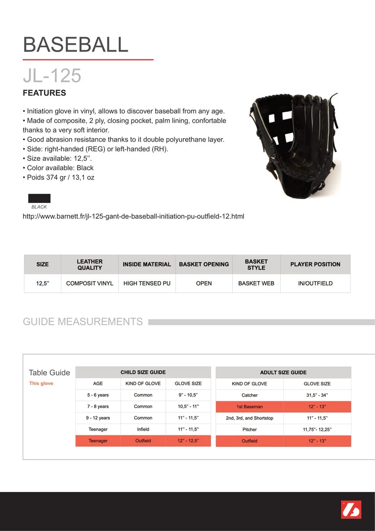 Initiation vinyl glove, enables to discover baseball at any age. Polyurethane, 2 foldings, closed pocket, palm reinforcement. Very comfortable with soft inside and resistant to abrasion thanks to its double polyurethane layer.